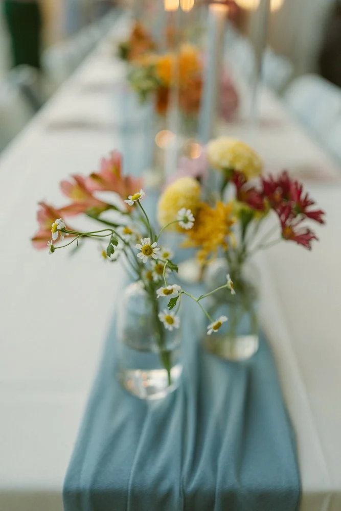 Their nursery was the perfect backdrop, blending rustic charm with a whimsical twist. Fall leaves in fiery oranges and deep reds framed the ceremony, creating a natural canvas for the rainbow floral arrangements. Emily’s best friend designed the florals, and they were breathtaking — vibrant pops of color that added a joyful energy to the day.